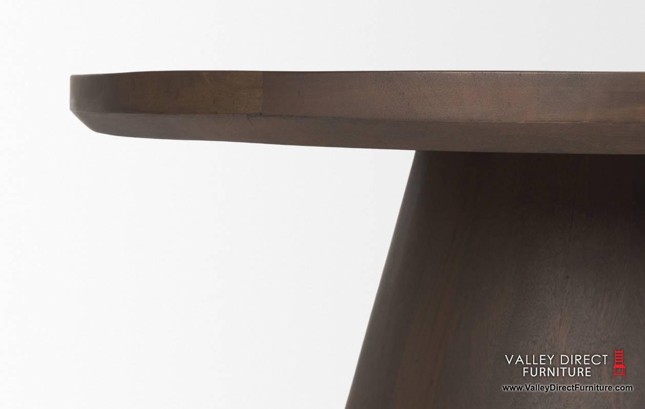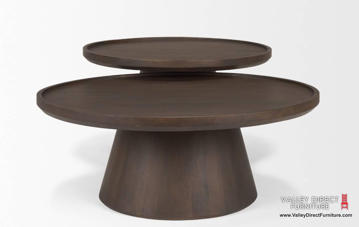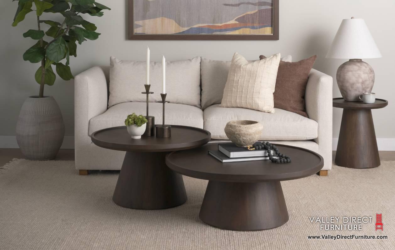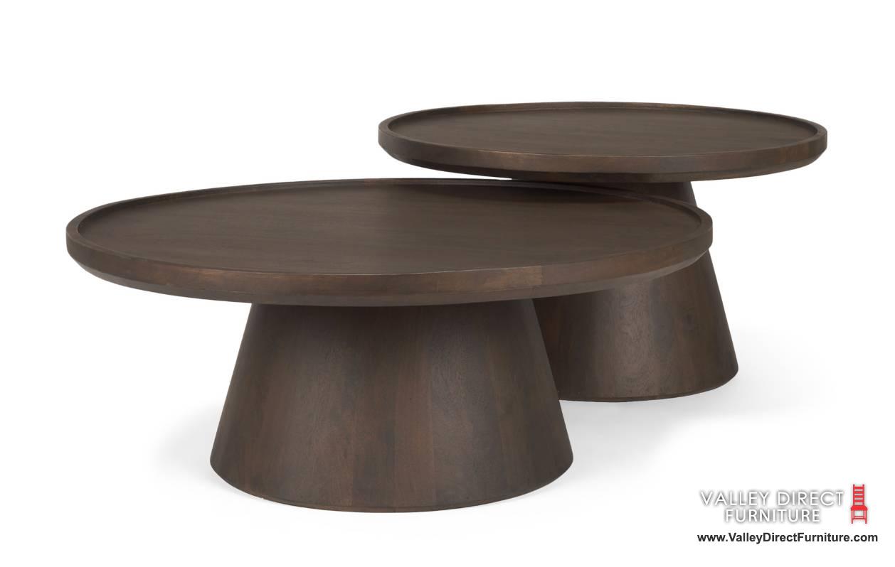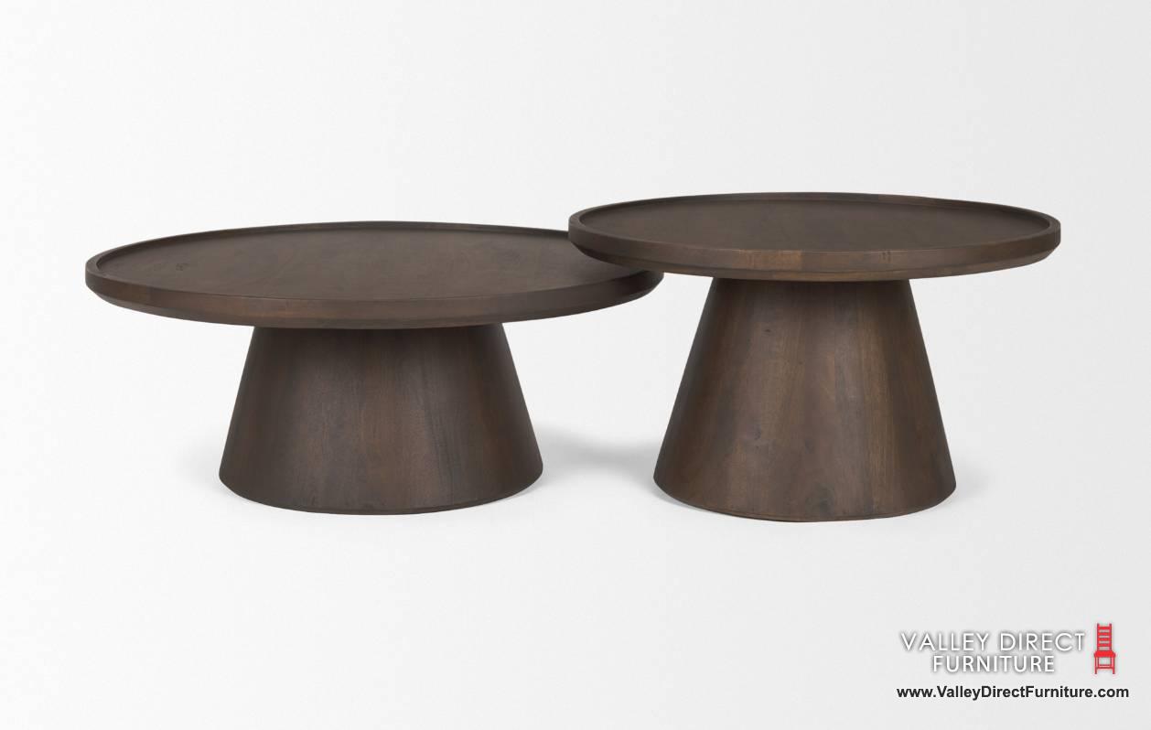 The Takoda Coffee Tables are thoughtfully crafted from mango wood with a deep medium brown finish. Both with a tapered drum base, offer robust support, while the round tray-style tabletop, adorned with delicately raised edges, exudes both practicality and rustic allure. Elevate your space with this versatile piece, blending functionality with timeless charm.