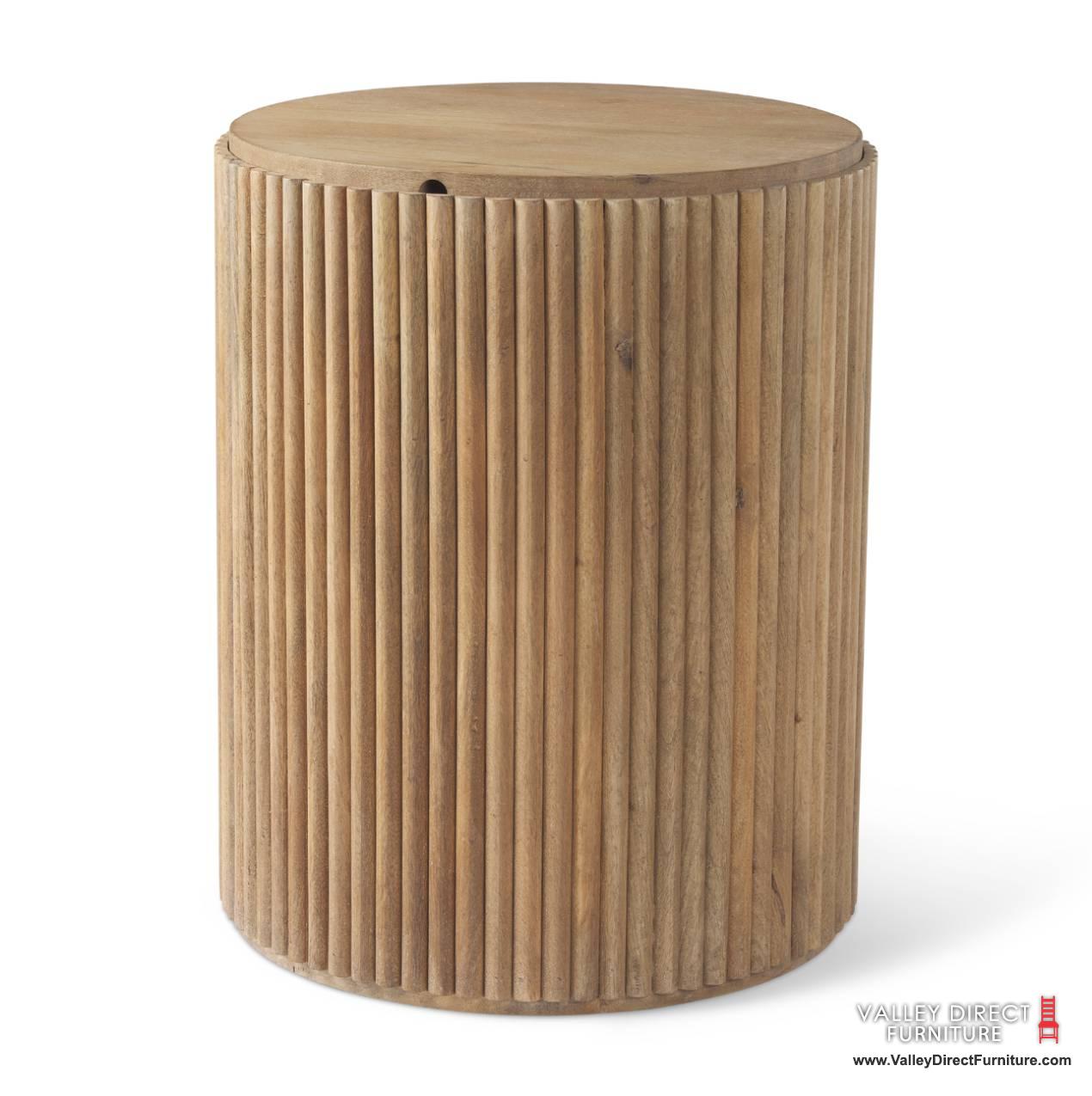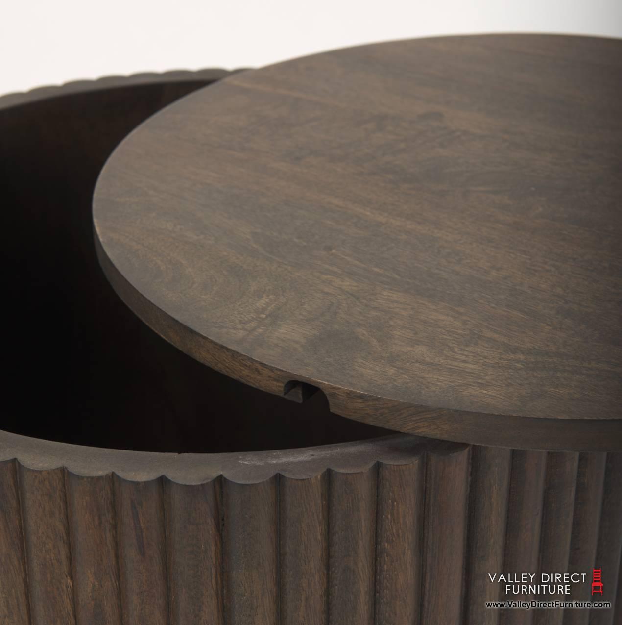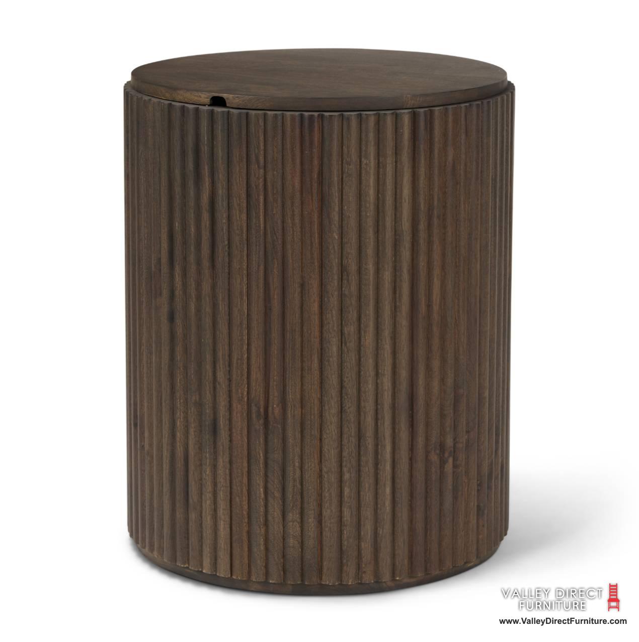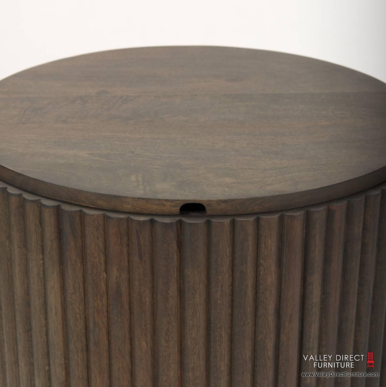 The decadent, dark brown or light brown Terra Side Table is a beautiful statement piece to include in the home or office space. Bold, contemporary, and trendy this eye-catching piece has been fashioned from solid mango wood, whose beautiful grain can be seen on the round top and amidst the fluted round base. Not only is this side table stunning, but it also opens from the top to provide storage! This quality table pairs perfectly with the Terra Coffee Table, Dining Table, and Sideboard.