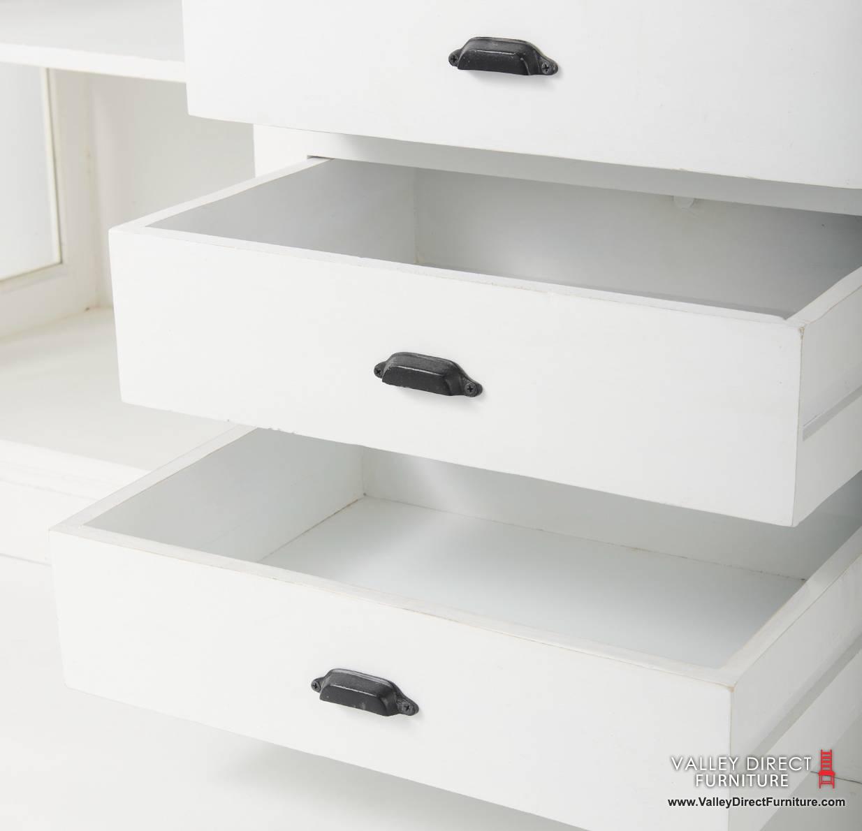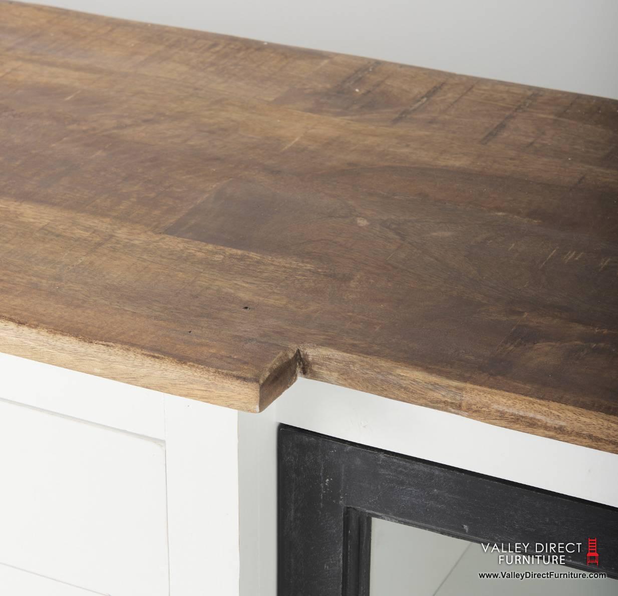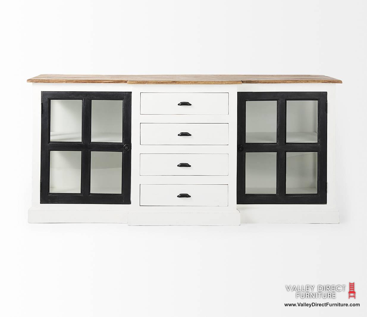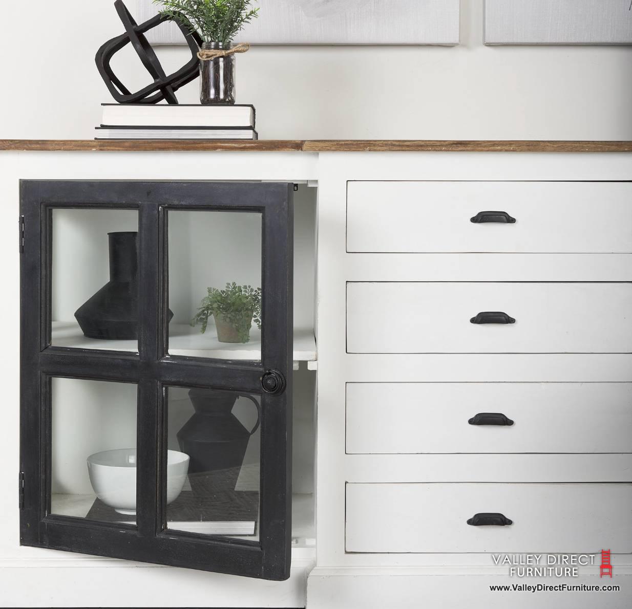 Built to last, our best-selling Bourchier sideboard is constructed from premium Mango wood with glass cabinets and glass side panels that lend an airy aesthetic to this solid piece. Factory-feel wooden frames in a distressed black finish front the glass doors, contrasting beautifully with the white-painted body.