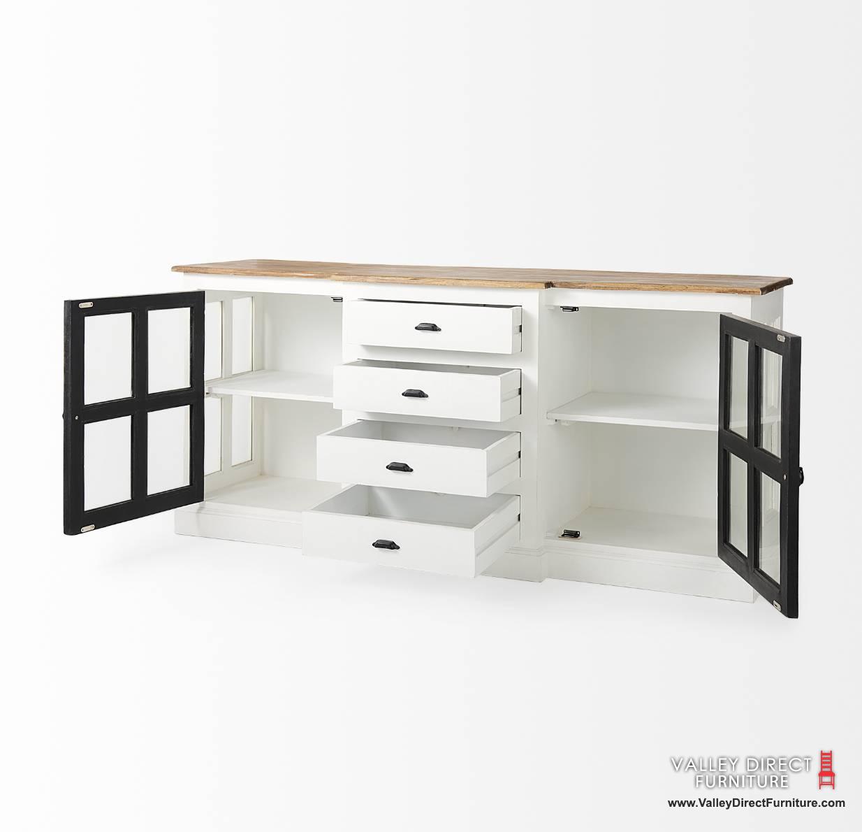 Two glass-door cabinets and four drawers blend storage and display in a versatile design that accommodates everyday essentials and show-worthy trinkets, inside and on top. Use in kitchens, dining rooms, living rooms, bedrooms, entryways, and hallways "“ the possibilities are endless!