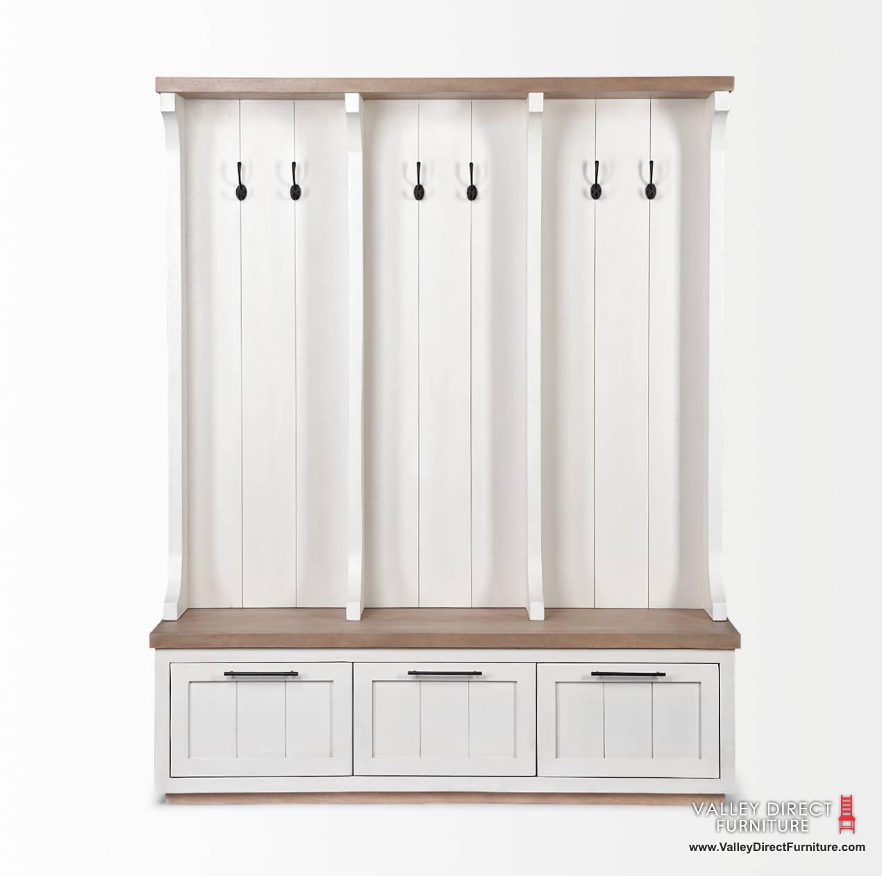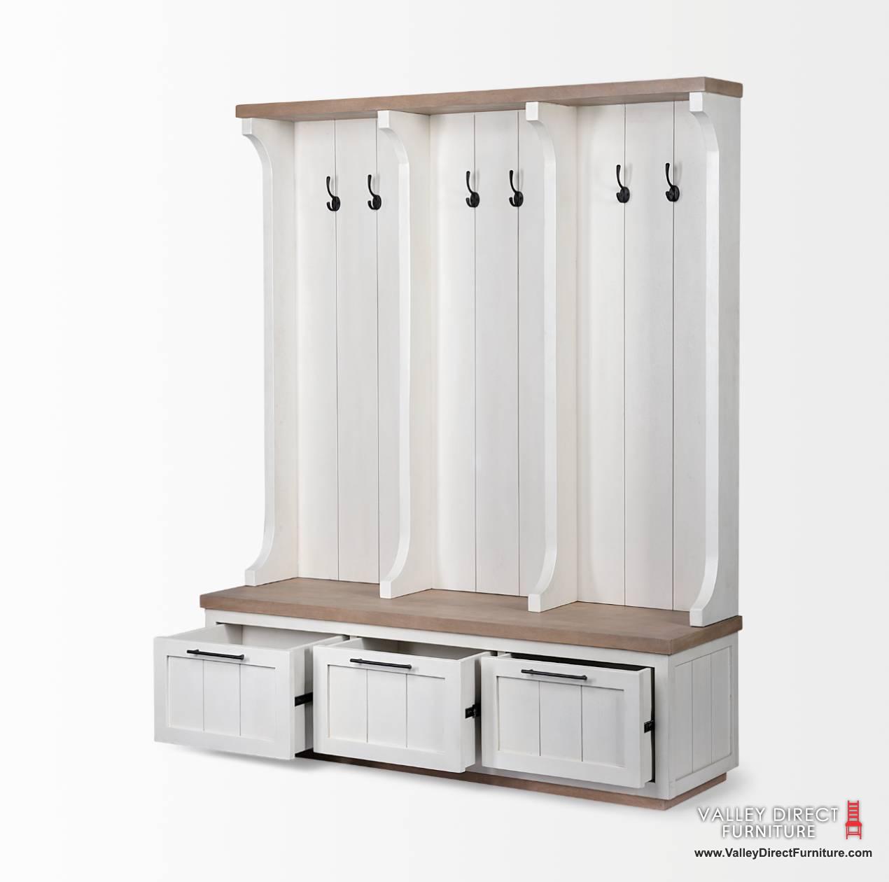 This amazing hall tree flaunts wooden shelves and drawers with farmhouse-inspired metal hardware that adds to its stylish visuals.