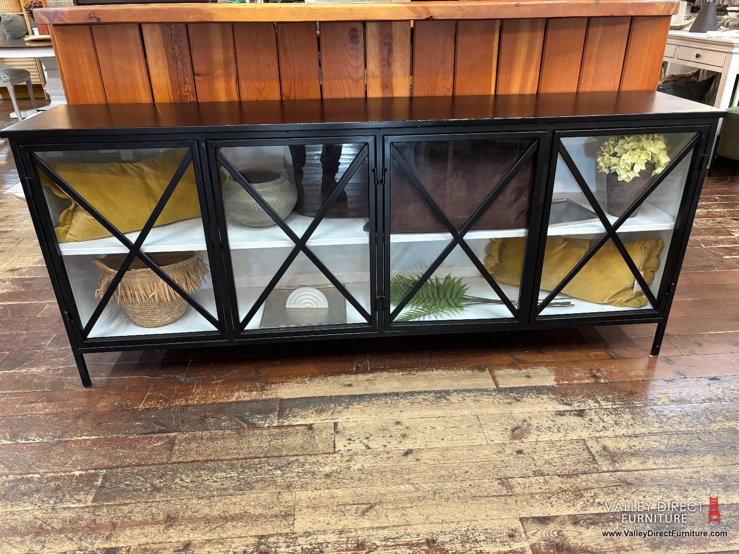 Aurelia Sideboard Clearance SALE Price: $899 Was $2,299 Some surface scratches on the top & sides Only 1 available The Aurelia is a thoughtfully designed collection for the modern home; a bright white interior is beautifully framed by a simple, matte-black metal frame. The Aurelia is a modern, but transitional collection providing stylish storage solutions. Dimensions 79''L x 16''D x 33''H Glass and Metal Construction This modern accent cabinet features a sturdy iron structure finished with four glass doors overlaid by simple crisscross metal detail. It has an airy aesthetic, standing off the floor on four slender, straight legs. Black and White Finish The bright white interior is beautifully framed by the simple, matte-black exterior - a fresh combination that stands out in the best way! Ample Storage/Display Space Two stationary shelves run along the cabinet interior, providing ample space to store and display special trinkets or everyday essentials. Modern Inspired Design A simple blend of neutral colors, straight lines and smooth planes, this piece is right at home in modern interiors!